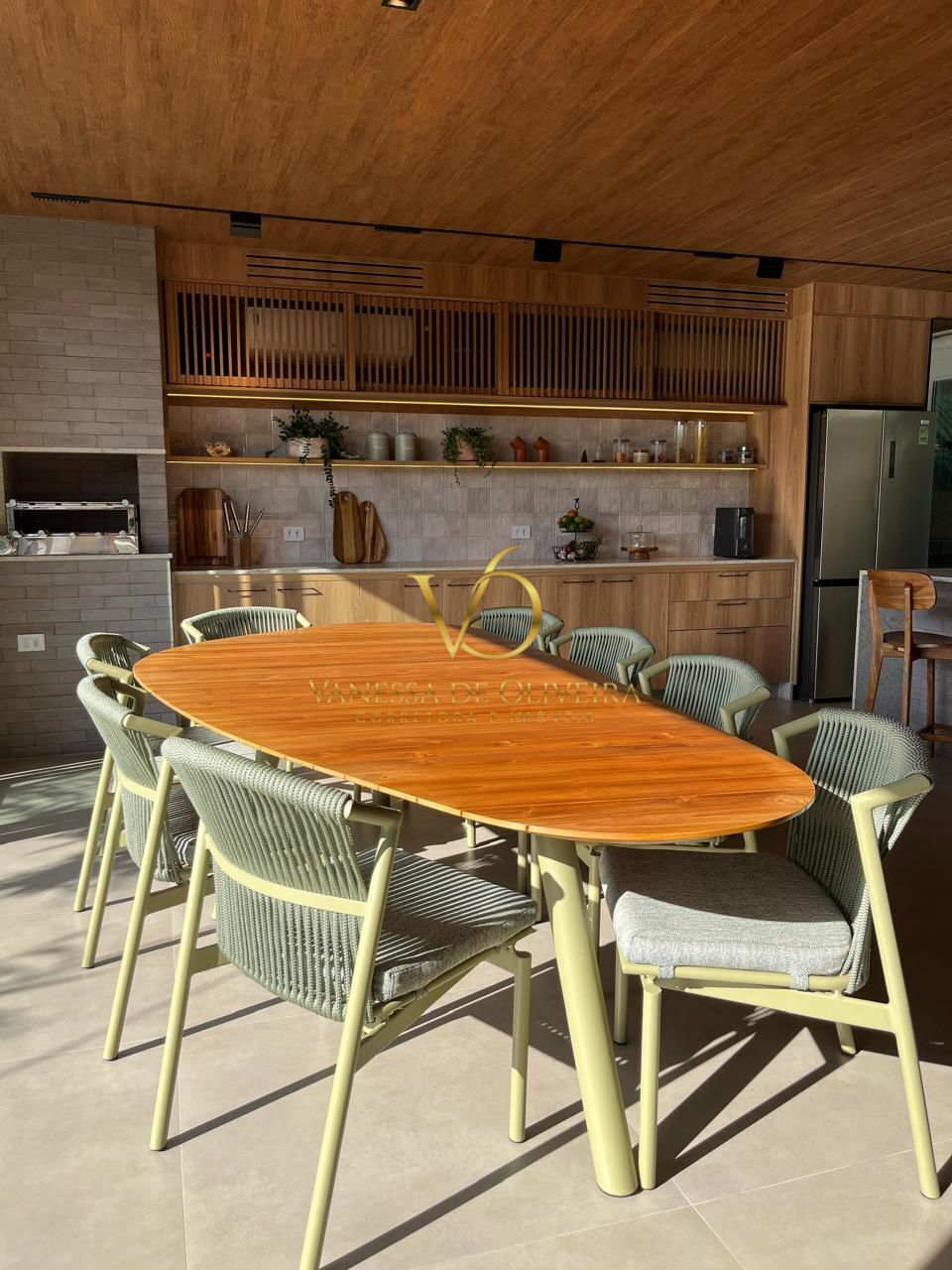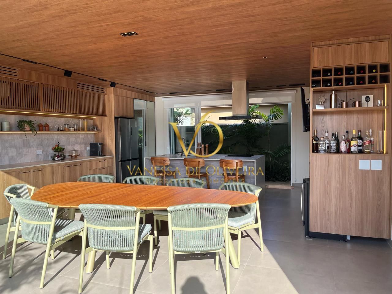 O espaço ainda conta com bar e adega integrados, mesa com oito cadeiras Fibratto e três banquetas Fibratto que compõem o balcão gourmet.