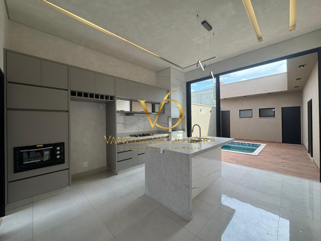 A sala é integrada à área gourmet, com pé-direito alto, proporcionando amplitude e excelente iluminação natural. Os ambientes são planejados e contam com armários, cooktop, forno elétrico, sugar e churrasqueira, além de bancadas em mármore que elevam o padrão de acabamento.
